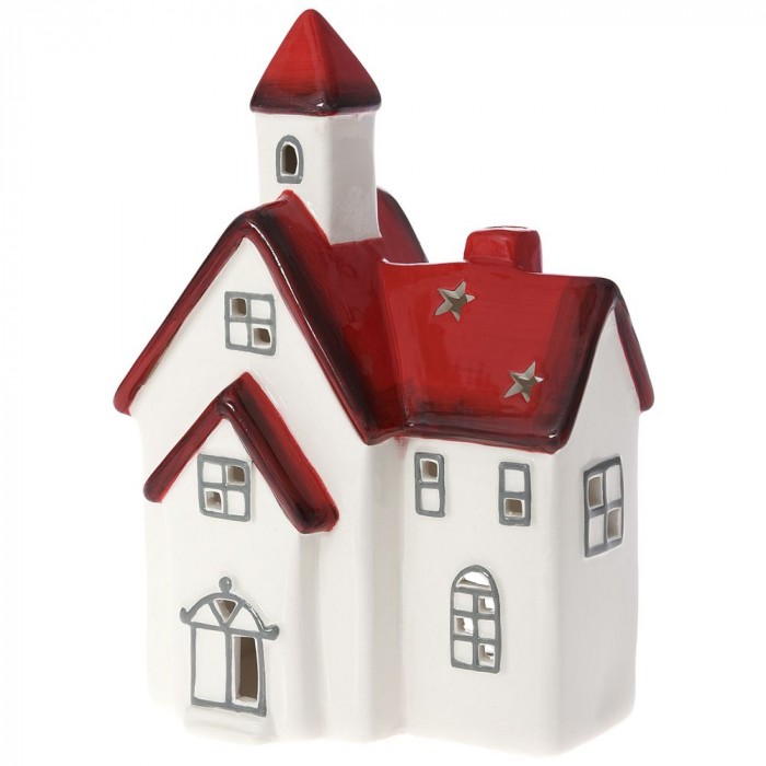 Керамичен светилник бяла къща с червен покрив, гланц, 12х8х18 см