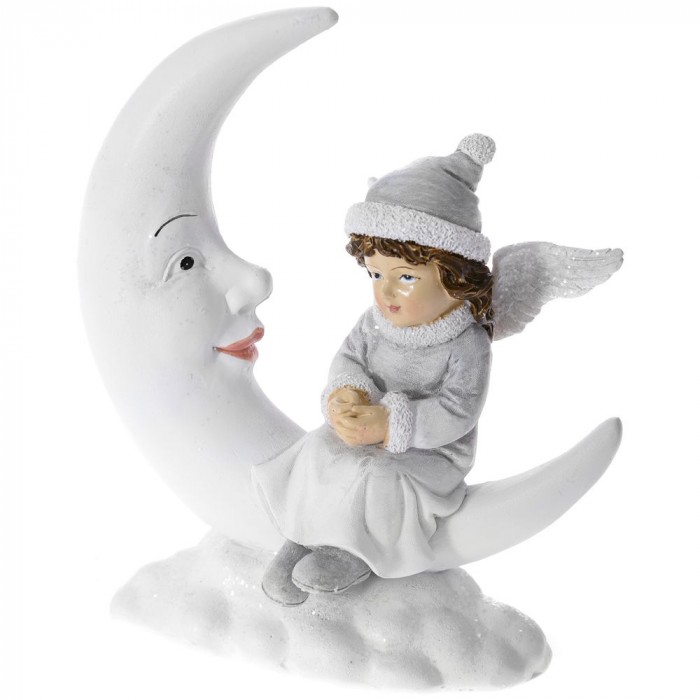 Керамична фигурка, ангел с луна върху облак, бяло, 13х7х15 см