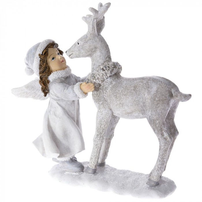 Керамична фигурка, ангел с елен, бяло, 17х6х15 см