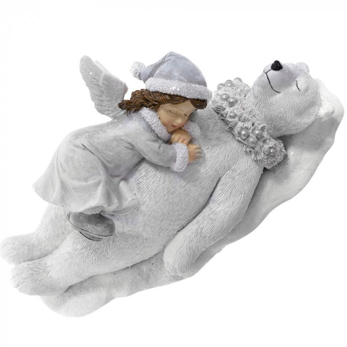 Керамична фигурка, ангел с мечка, бяло, 19х10х11 см