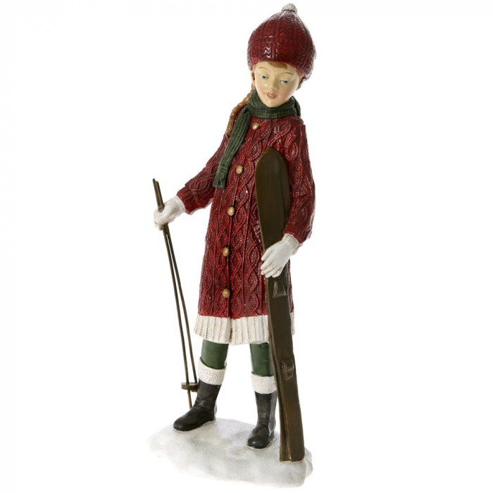 Керамична фигурка, дете със ски, червено - зелено, 13х8х24 см