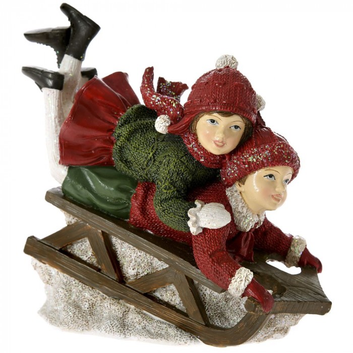 Керамична фигурка, деца върху шейна, червено - зелено, 15х7х14 см