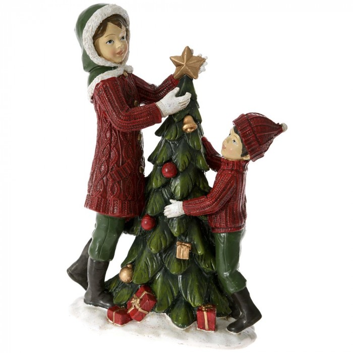 Керамична фигурка, деца с елха, червено - зелено, 14х8х21 см
