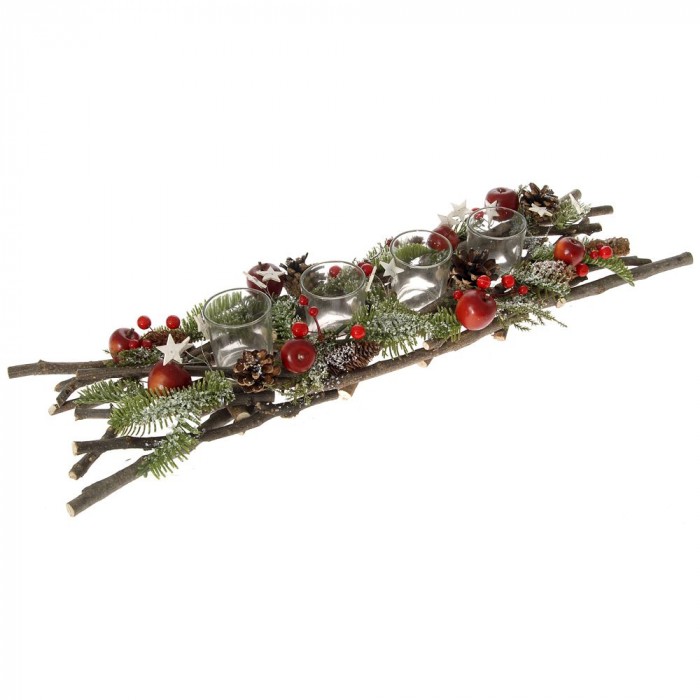 Коледна аранжировка дърва, червени топчета и 4 свещници чашки стъкло 63Х16Х8СМ