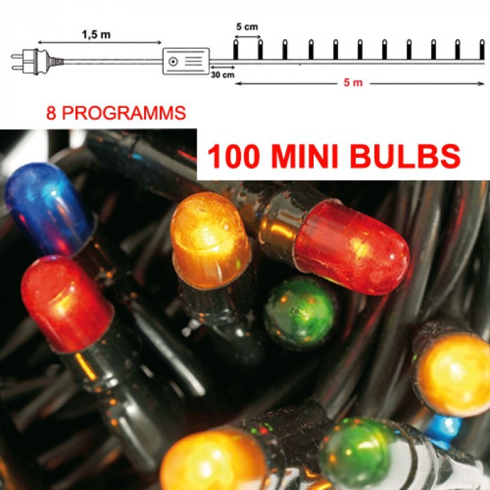 Коледни лампички 100бр.,зелен кабел,разноцветни,8 програми,6.5М