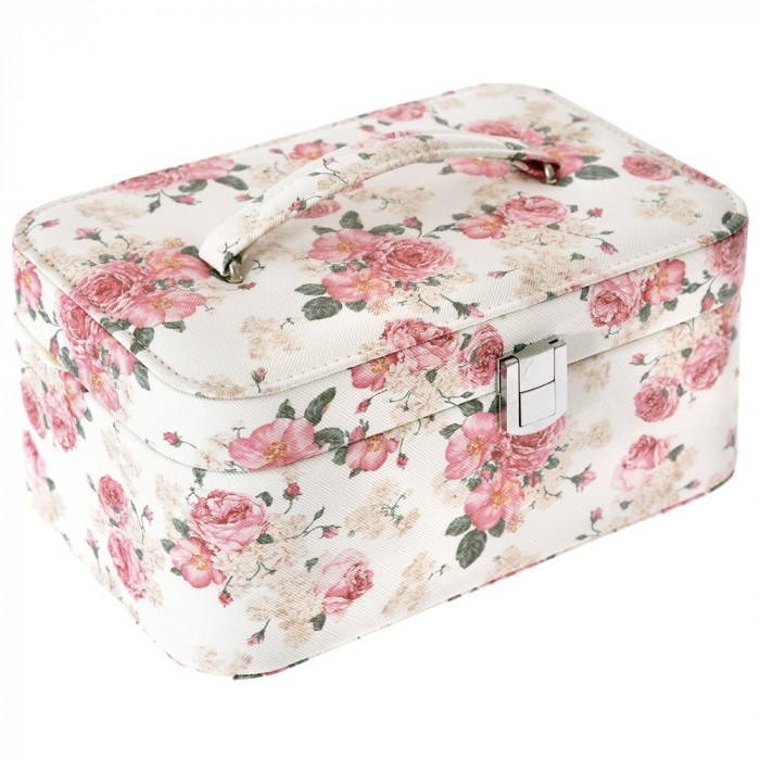 Кутия за бижута от кожа, бяла с рози, 22х15х11 см