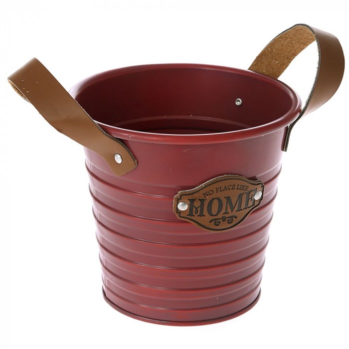Метална кофа с кожени дръжки, червена, Ф15х14 см