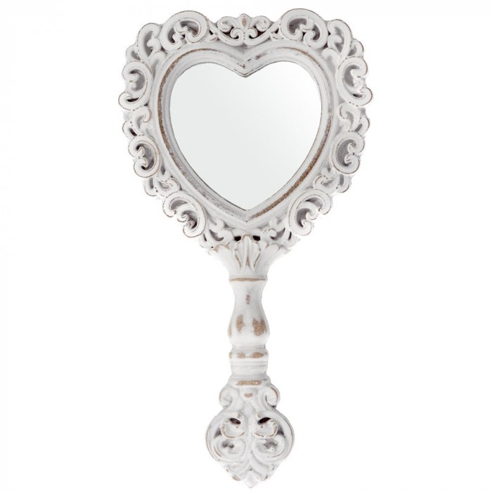 Огледало сърце за ръка, ретро, претрито бяло, дървено, 14х26 см
