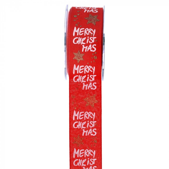 Панделка брокат MERRY CHRISTMAS, червена, 3,8 Х 9,1 М
