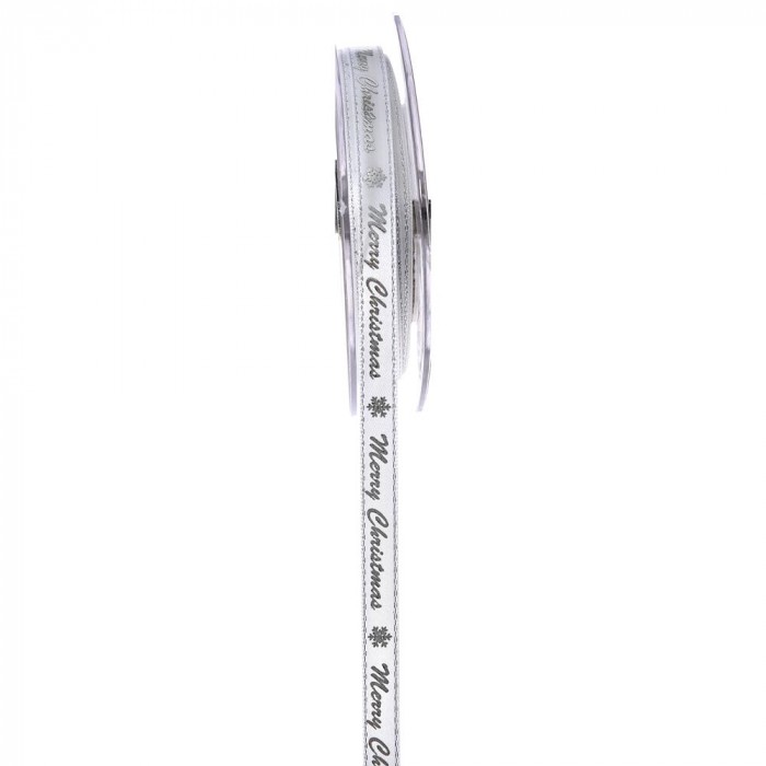 Панделка сатен MERRY CHRISTMAS, бяло - сребро, 1х18 М