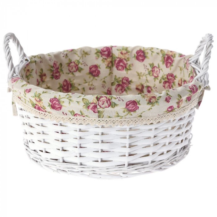 Плетена кошница с плат, рози, бяла, Ф36х15 см