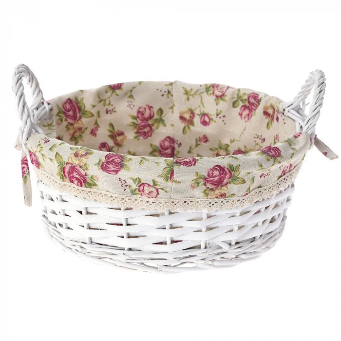 Плетена кошница с плат, рози, бяла, Ф30х12 см