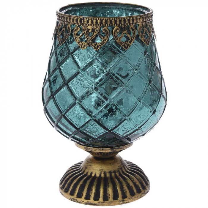 Свещник стъкло с метален обков на столче, син, Ф13х19см