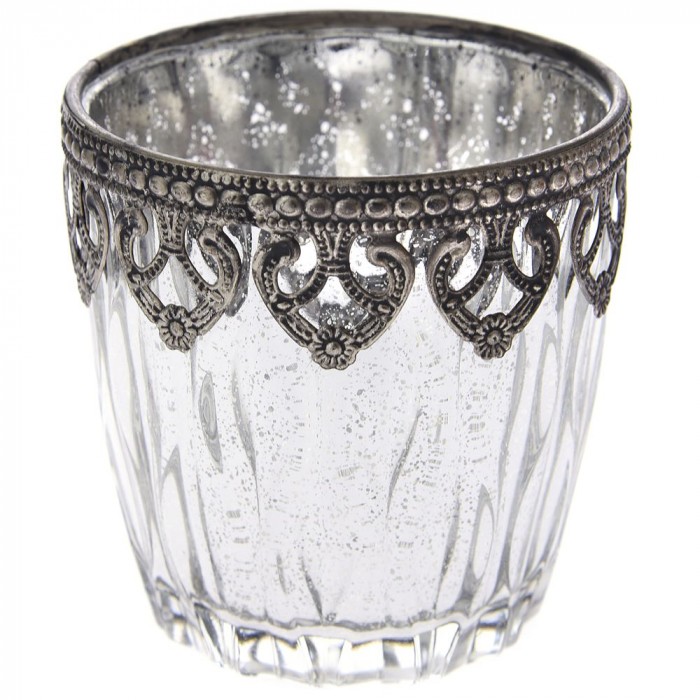 Свещник стъкло с метален обков, сребро, Ф10х9см