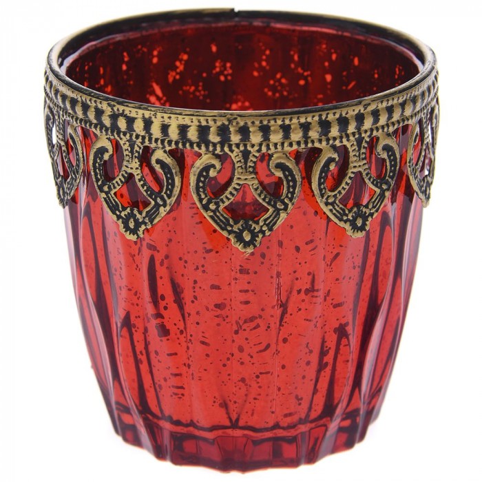 Свещник стъкло с метален обков, червен, Ф10х9см