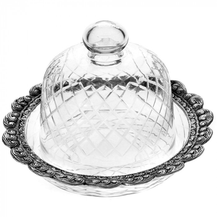 • Стъклен поднос за торта с метална декорация и капак, Ф20х14 см
