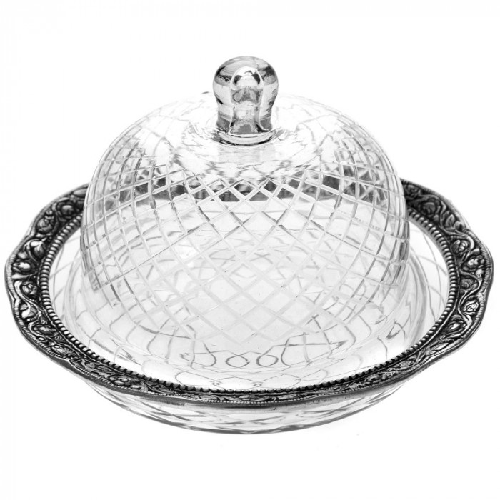 • Стъклен поднос за торта с метална декорация и капак, Ф14х15 см