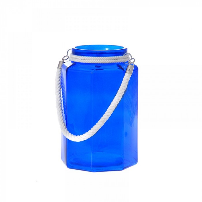 Стъклен свещник с въжена дръжка, син, 17х17х26 см