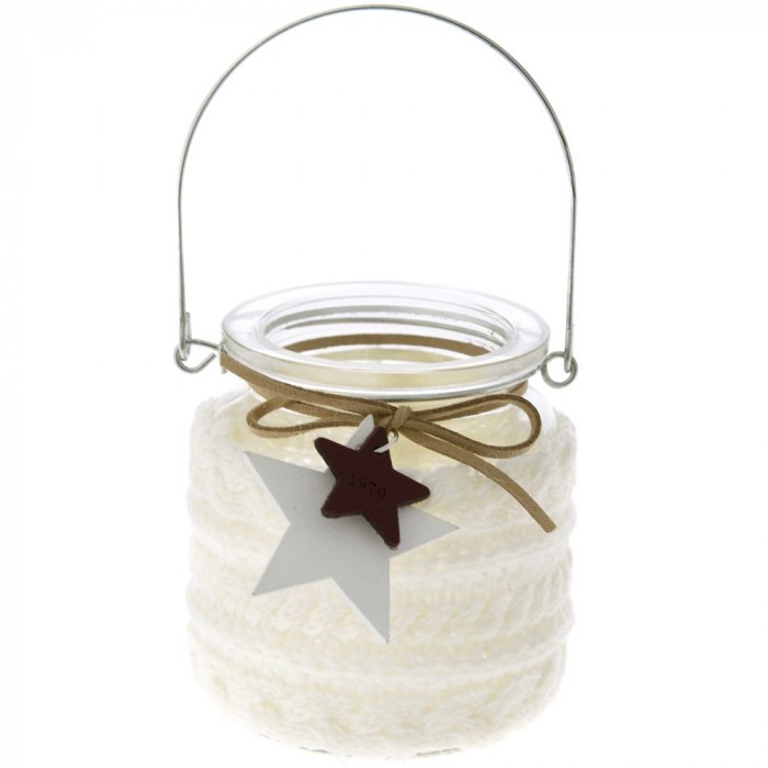 • Стъклен свещник, бял, дантела и звезда, 8х9 см