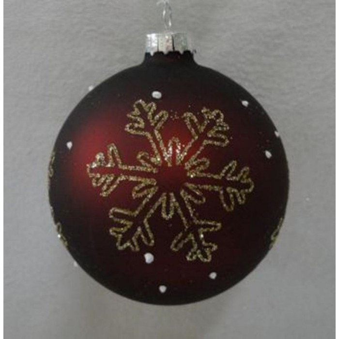 Стъклена топка с рисуван декор , златна снежинка , бордо, к-т 4 бр, 8 см