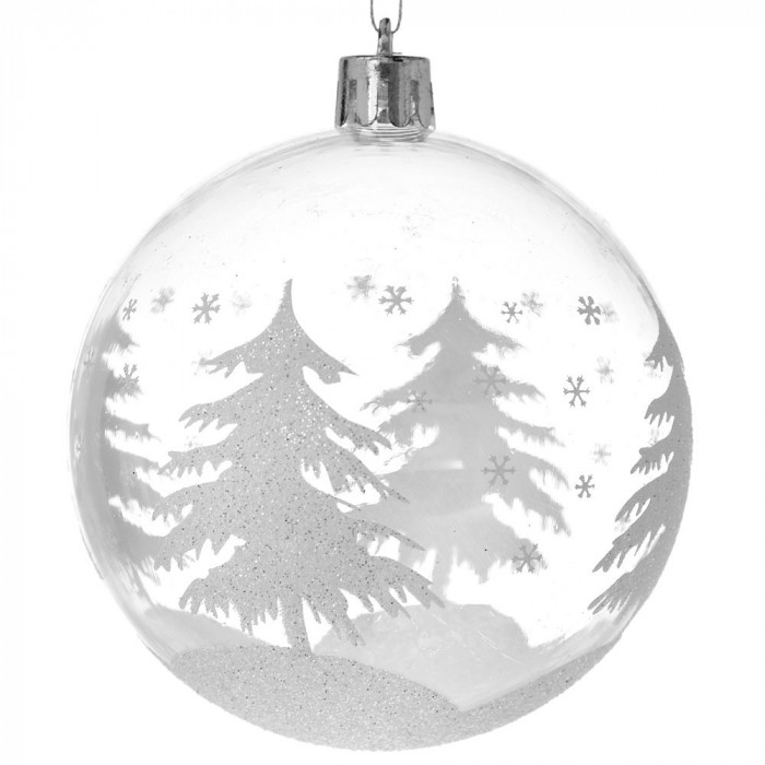 Топка пластик, прозрачна, зимна гора, бяла с брокат, 6 бр., 8 см