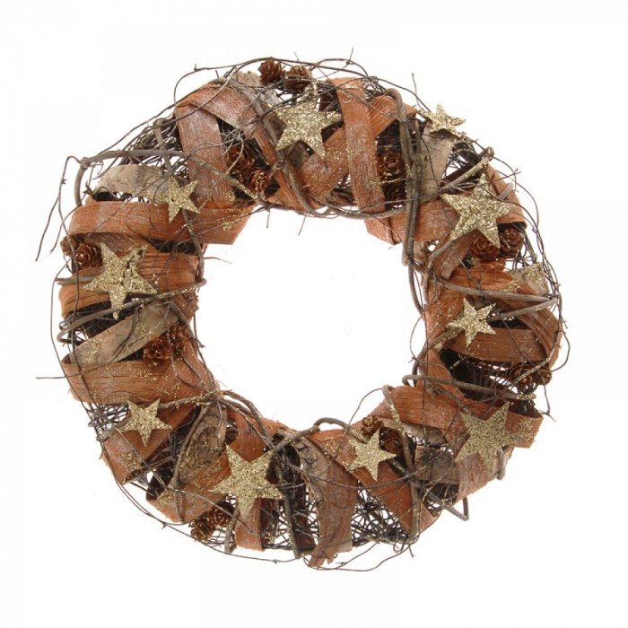 • Венец от преплетени клони и звезди дърво,златен брокат, 33 см