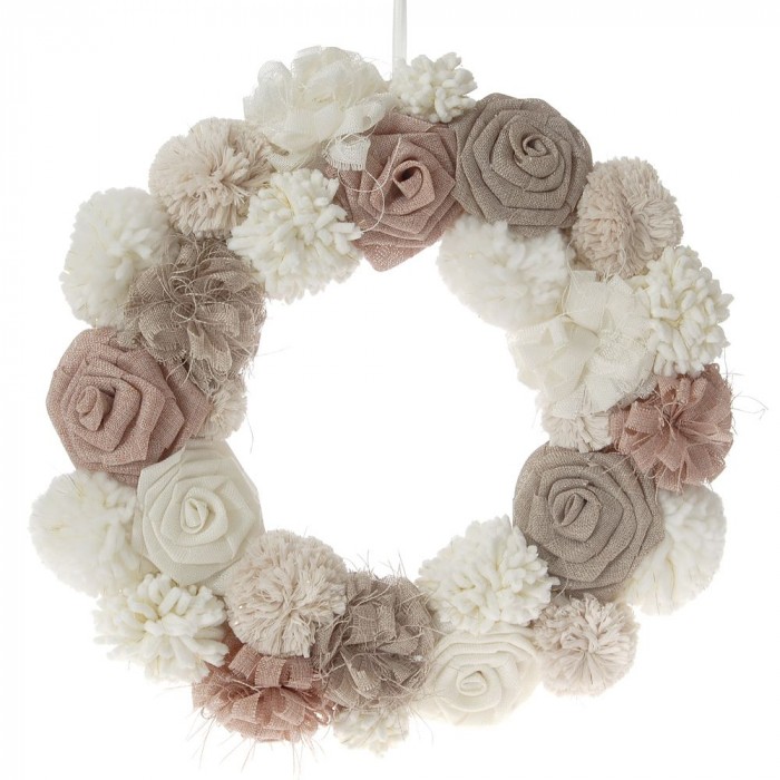 Венец от текстилни рози и памукови топчета, Ф 48 см