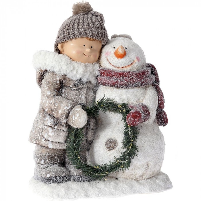 Фигурка момче със снежко, светеща, поли, светло кафяво, 33х22х40 см