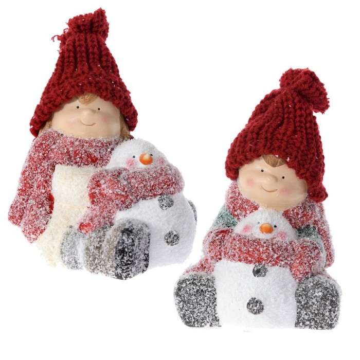 Фигурки момче и момиче с червени шапки и снежко, комплект, поли, заснежени, 11х11х13см
