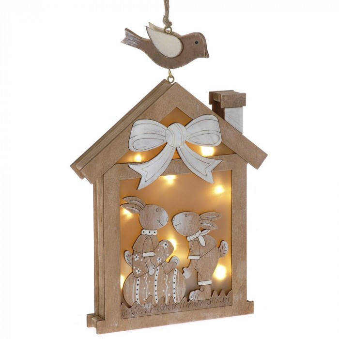 Висулка със светлина, дървена къща със зайци, 17х25 см