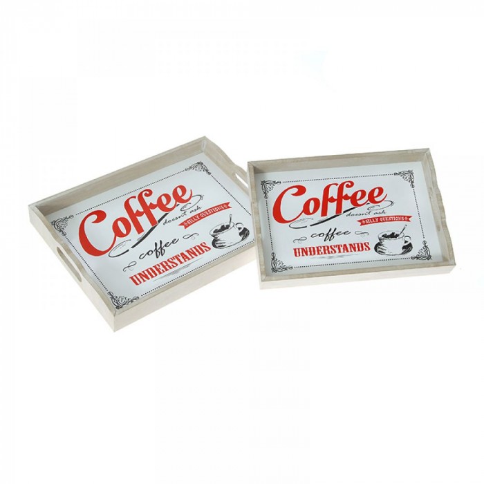 Дървен поднос " COFFEE", бял, к-т 2бр, 40х30/35х25 см