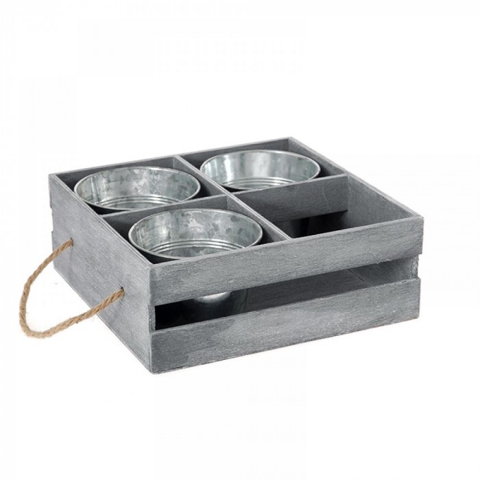Дървен сандък с 3 метални кашпи, сив, 25х25х10 см