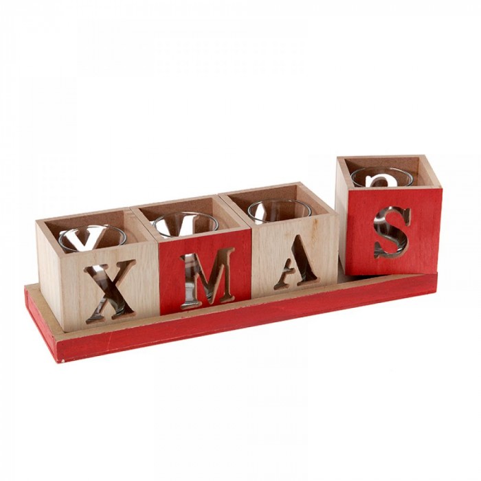 Дървен свещник, кубчета "X'MAS",червено и бяло, 34х10х8 см