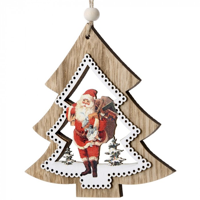 Дървена висулка, елха, ретро Дядо Коледа, бяло и натурал, 10 см
