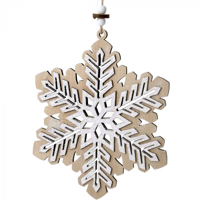 Дървена висулка снежинка, натурал и сребърен брокат, 16х17 см