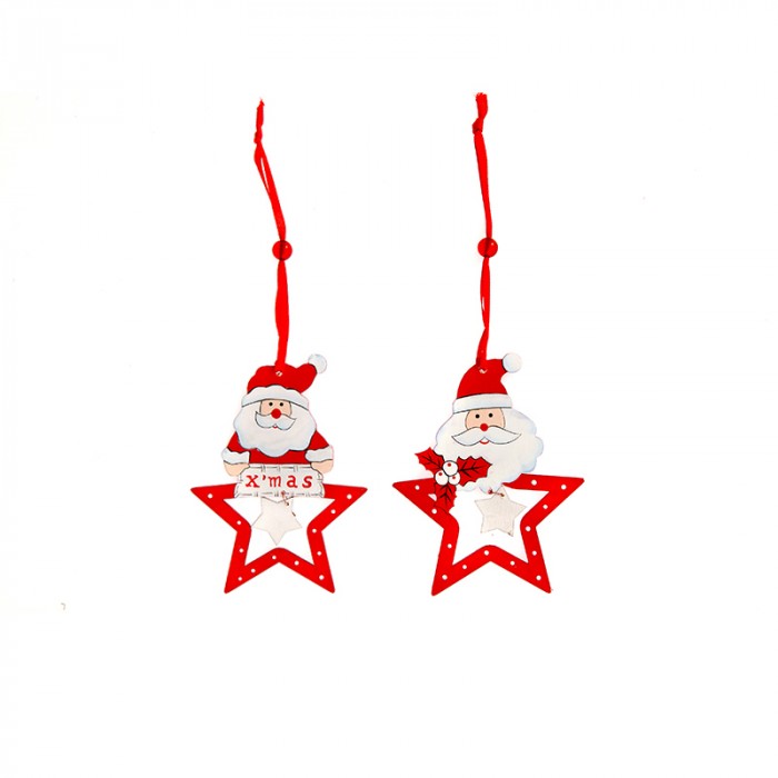 Дървена висулка звезда с дядо коледа, бяло и червено, 2 бр., 10 см