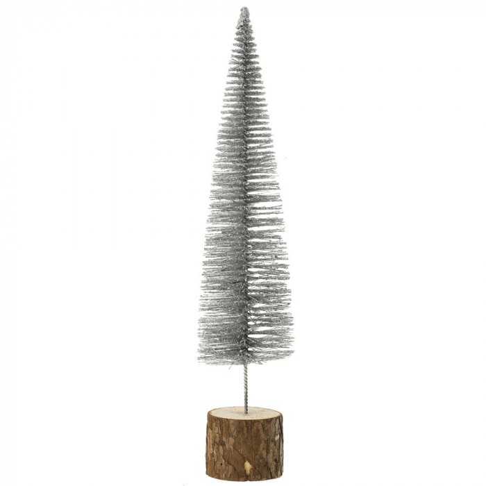 Елха пластик върху дървено пънче, сребро, брокат, 9х38 см