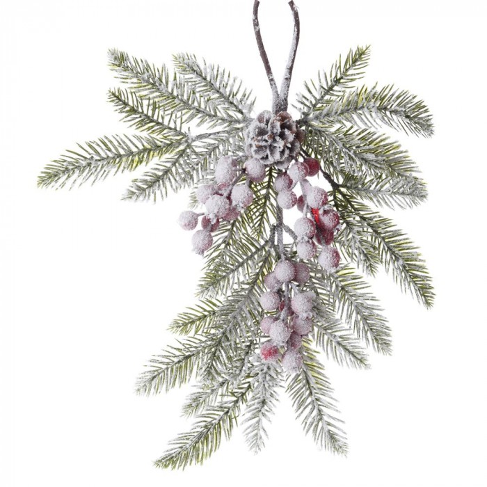 Елхови клон висящ, заснежен с шишарки и червени топчета