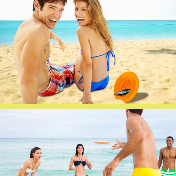 This flying disk amplifier can be used as a flying disk and... wait for it... an amplifier. Simply place your phone speaker gadget into the hollow and the sound will be amplified doublefold! When not in use as an amplifier flatten the Fli-Tunes and get active by using it as a flying disk. Great for the park or beach! -Flying disk and amplifier in one! -Available in orange -Made from silicone