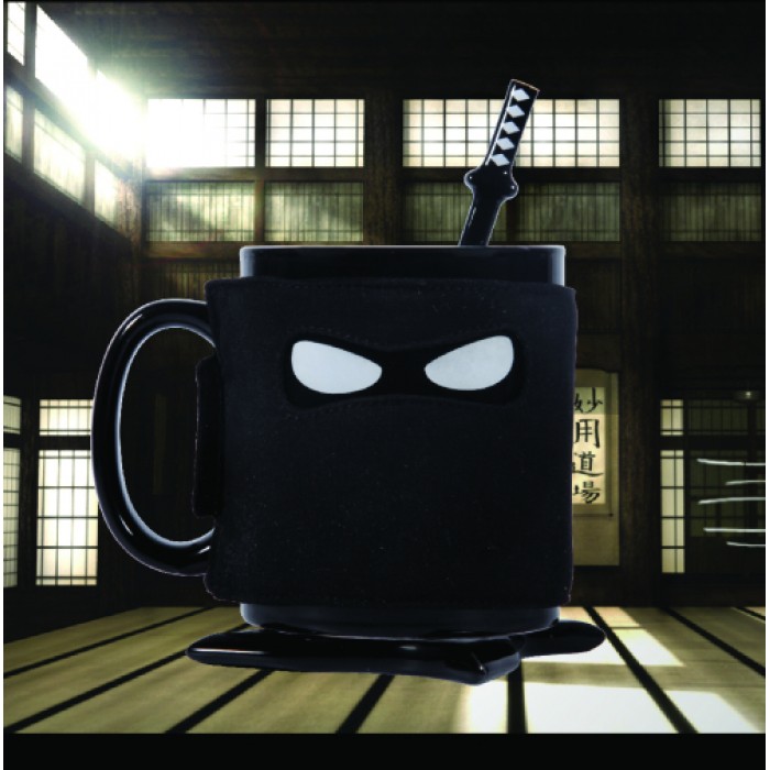 Even silent assassins need a tea break - Ill take mine with 2 sugars and pain. Need to get your energy back for stabbing and jumping stealthily? This Ninja Mug will instantly revive your spirits - use it to hold your cup of tea. Note: green tea is the most ninja-like but have a builders tea if you must. Place the mug onto the ninja star coaster and stir in your sugar using the ninja sword spoon for full effect. - Included: ceramic mug - 8.5cm (dia) removable ninja cover samurai spoon and ninja star/shuriken coaster - Ninja cover includes a pocket for the samurai spoon - Microwave and dishwasher safe - please remove cover before washing or heating