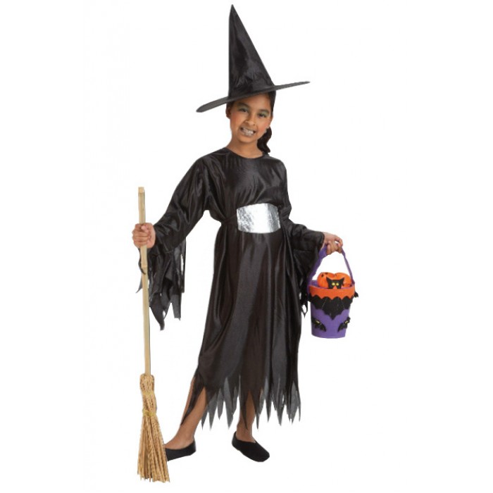 Детски костюм Черна вещица се състои от рокля, шапка и колан, изработени от трико. Предназначен е за момичета от 6 до 10 години. Подходящ за Хелоуин, парти, карнавал, училищни празненства и забави.