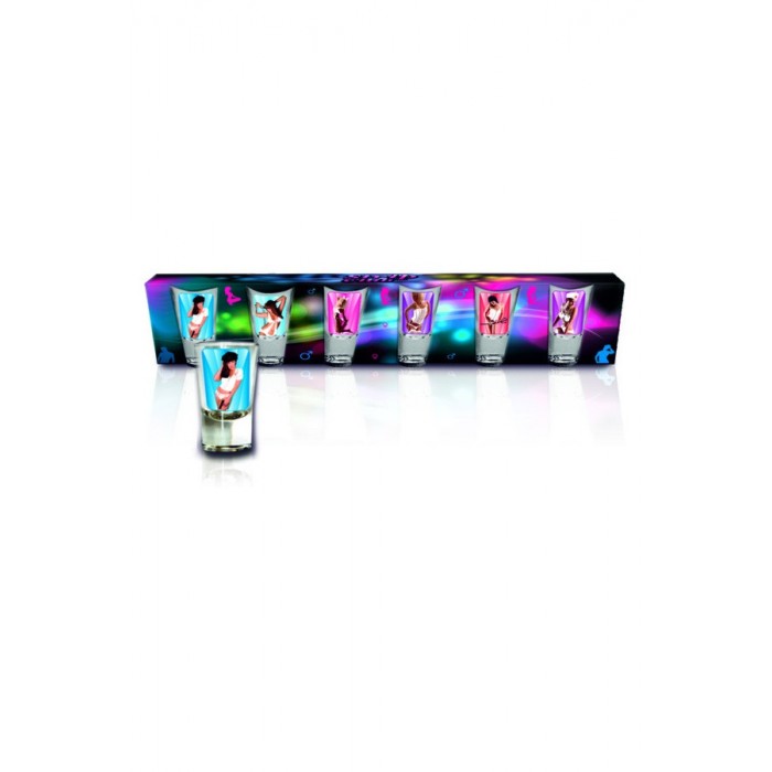 Комплект от 6 броя стъклени шотове по 25ml с мацки, които се разсъбличат при наливане на ледено студена напитка.