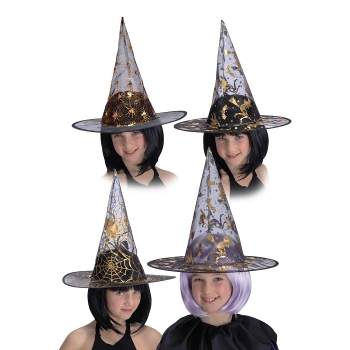 Шапка на вещица, детска с височина 30 см. Предлага се в четири разновидности. Подходяща за Хелоуин, парти, карнавал, училищни празненства и всякакви забавления.