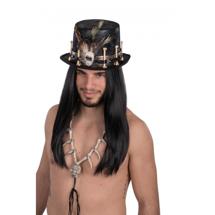 Шапка Цилиндър Вуду - черно кадифе с череп, пера и кости, висок 13 см. Подходящ за Хелоуин, парти и карнавал и всякакви забавления.