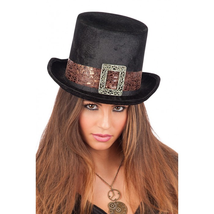 Шапка Цилиндър в стил Стиймпънк - черно кадифе с кафява лента и катарама, висок 14 см. Подходящ за Хелоуин, парти и карнавал и всякакви забавления.