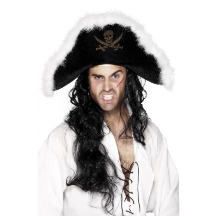 Шапка Пират, черна с бяло марабу, изработена от плат. Подходяща за парти, карнавал, Хелоуин и всякакви забавления.