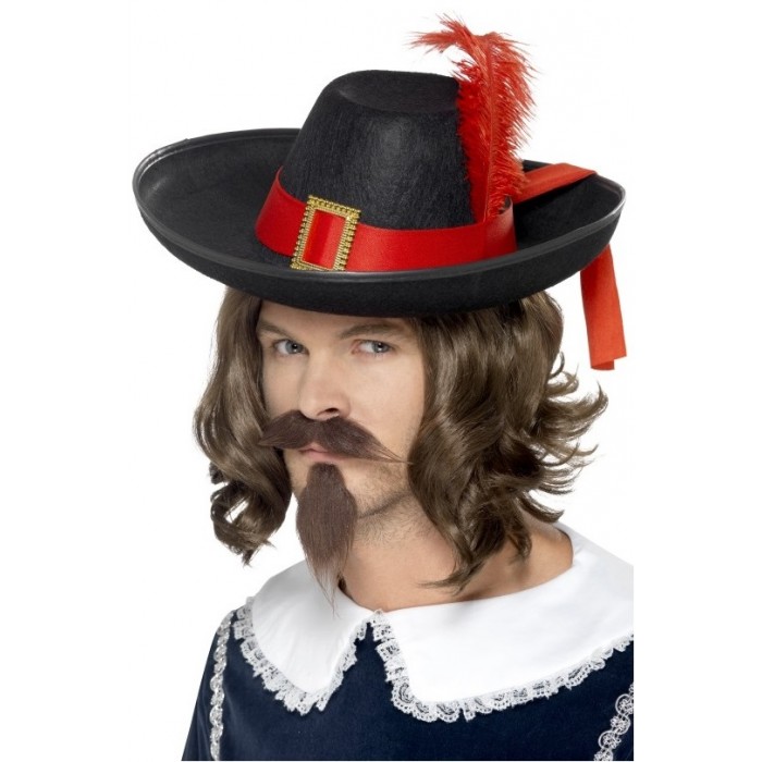 Шапка Мускетар, черна с червено перо и лента, изработена от филц. Подходяща за парти, карнавал, Хелоуин и всякакви забавления.
