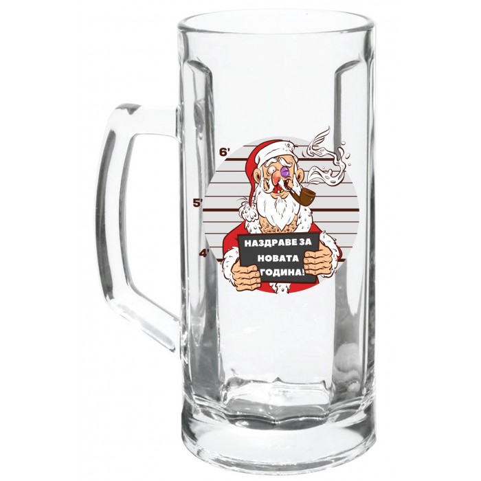 Стъклена халба за бира с картинка на Дядо Коледа - арестант и надпис "Наздраве за Новата година!". Страхотен подарък за Коледа и Нова Година.