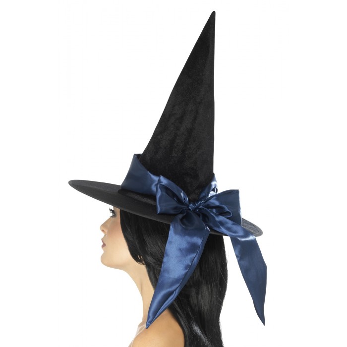Шапка Вещица, черна със синя лента и панделка е изработена от плюш и сатен. Подходяща е за Хелоуин, парти, карнавал, реквизит, бал с маски и други празненства.