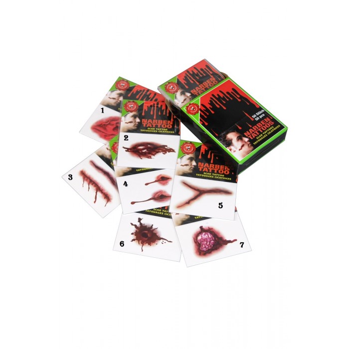 Татуировки, имитиращи рани. Особено ефектен и бърз начин да се включите в празнуването на Хелоуин.Начин на употреба:1. Махнете предпазната хартийка от татуировката.2. Поставете тауировката върху мястото, на което искате да я залепите (кожата трябва да бъде чиста и суха).3. Намокрете татуировката с помощта на гъба или плат напоени с вода.4. Изчакайте 25-30 секунди и премахнете внимателно излишната хартия.